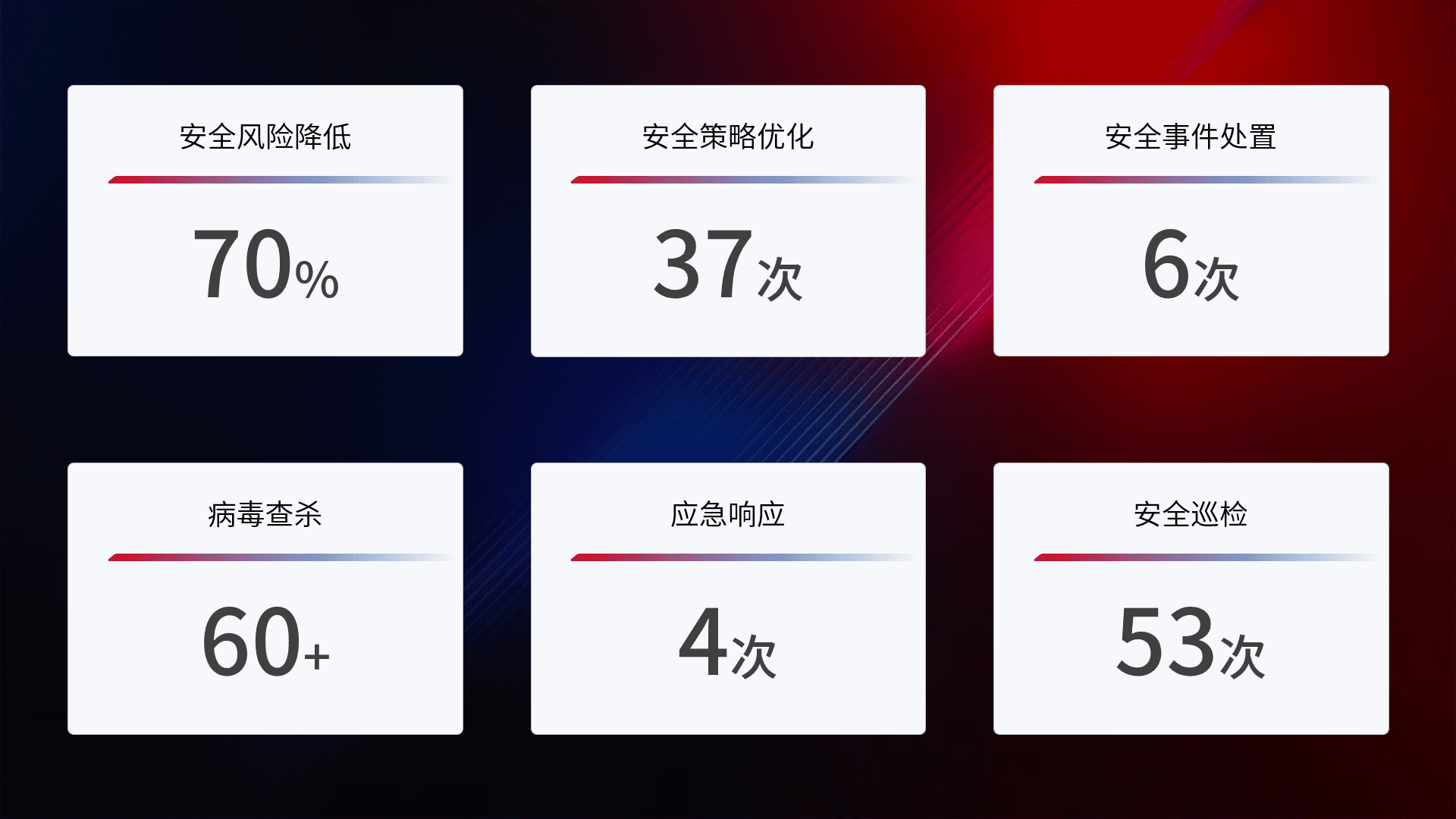 提供全面的安全事件报告体系,,包括处置报告、、、周报、、季度和年度总结,,结合持续监控,,,,帮助客户深入了解网络安全状况。。